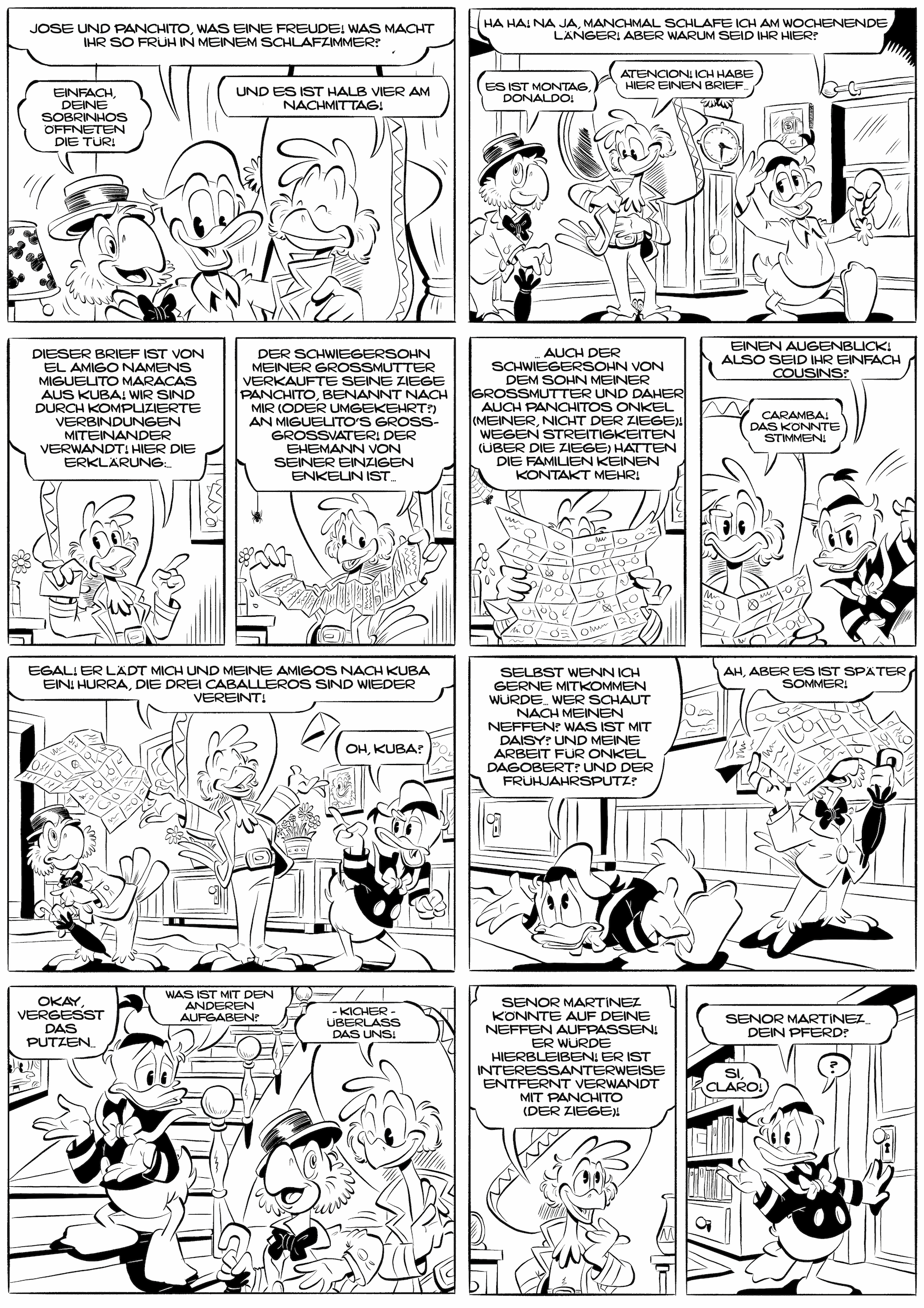 Hintergrund: Bei einem Museumsbesuch habe ich zum ersten Mal über den vierten Caballero gelesen. Es hat mich direkt gereizt, daraus eine Geschichte zu machen. Es ist quasi die Fortsetzung zu Don Rosas zwei Caballero-Geschichten. Vielleicht kann ich auch noch den Aracuan-Vogel in der Geschichte verstecken. Es gibt in Brasilien meines Wissens nach viele Geschichten mit den Caballeros, sogar Miguelito Maracas soll in einem Comic auftauchen. Leider kann ich die ganzen Geschichten nicht lesen…