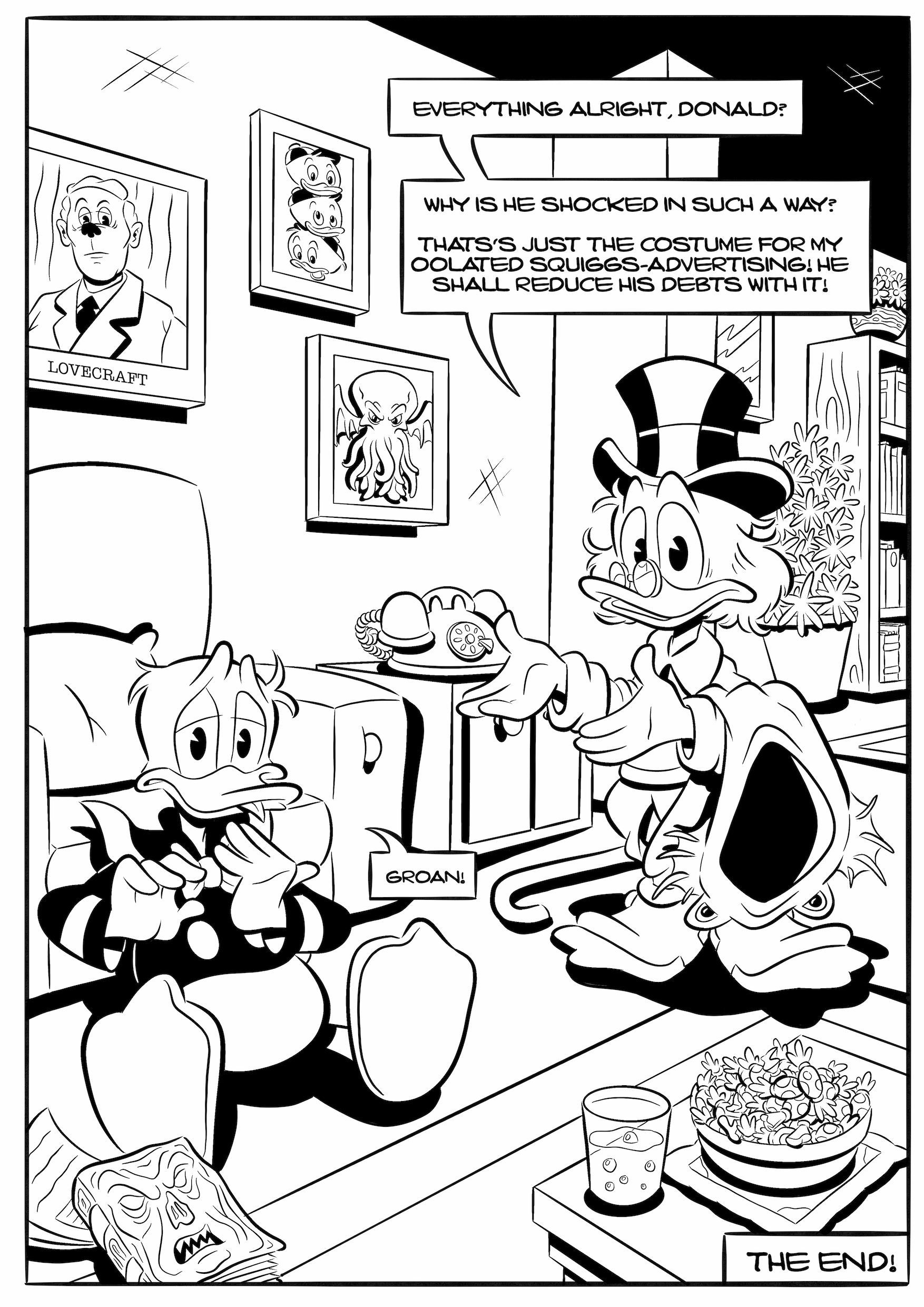 Background: Much of Lovecraft’s early story is beautifully vaguely described, so that some sentences could be completely taken over in a Disney comic. So the gag is to combine Lovecraft’s original text with Disney drawings. Who says the monolith described by Lovecraft doesn’t look like a money bin?